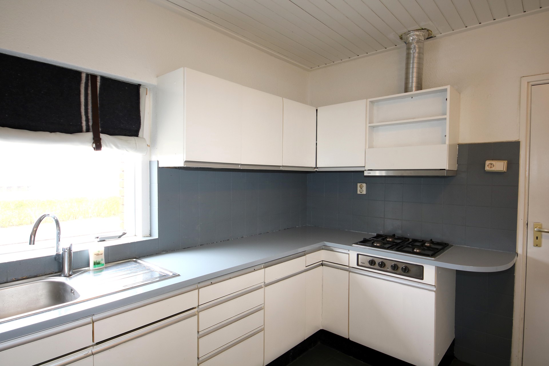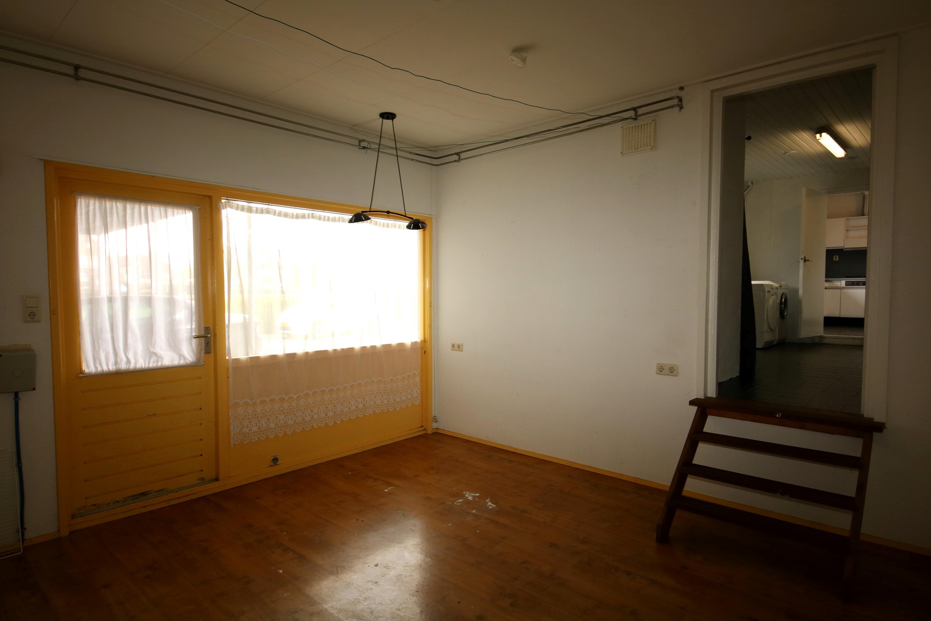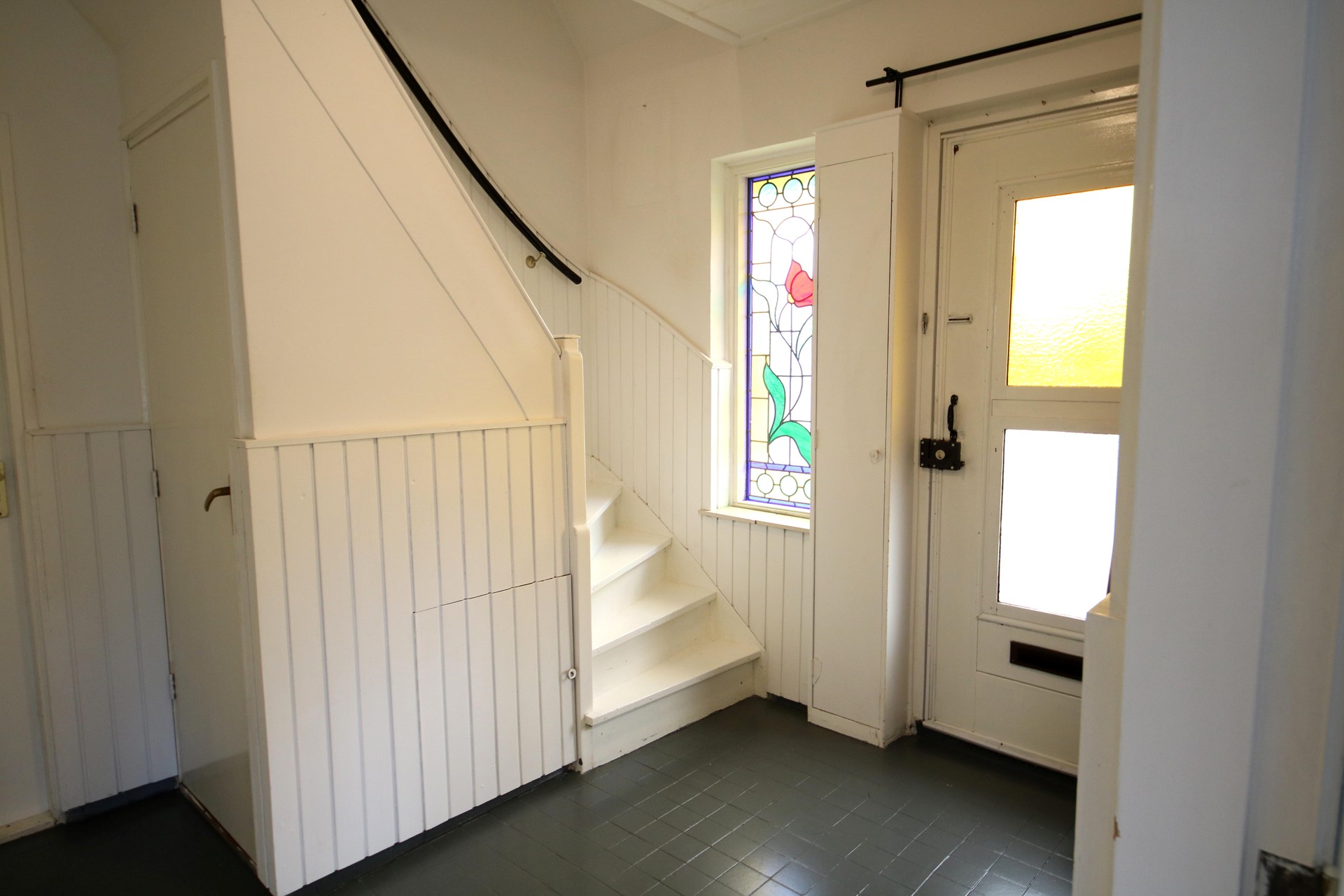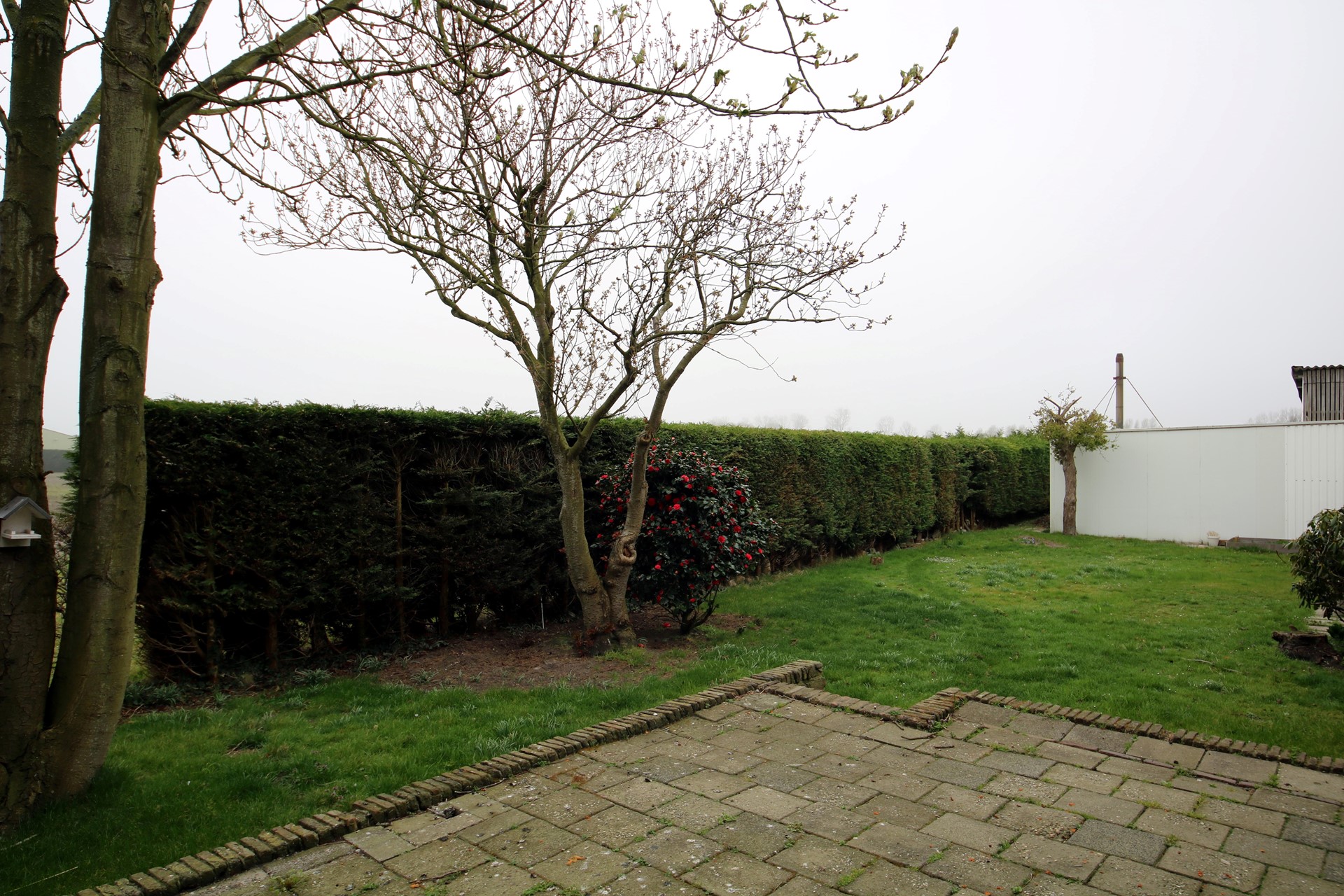 Through the driveway you arrive at the front door, the window next to the front door has beautiful stained glass. You enter the very spacious hall, with the toilet on the left, next to it the spacious living room, which runs in an L-shape, but is very spacious. from the hall you also enter the spacious kitchen, with an adjoining utility room. The kitchen has ample cupboard space and a gas hob. The utility room has enough space for a fridge, freezer, washing machine and dryer. From the utility room you also enter the backyard of the house, with a spacious terrace and a lovely lawn. The garden runs around the house, so it can be used optimally.
