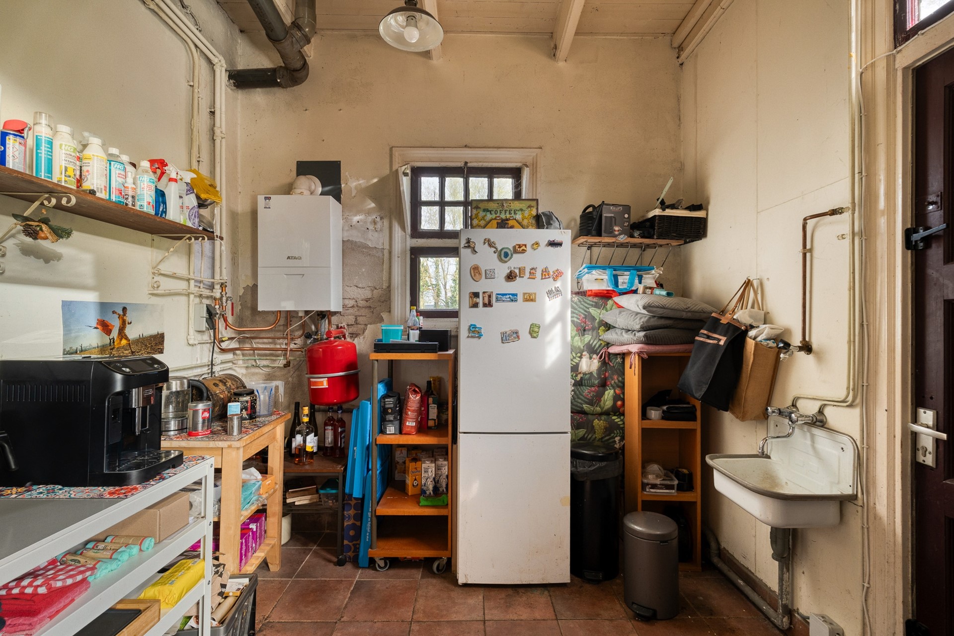 Bij binnenkomst valt in de hal meteen de originele granito vloer op, die toegang biedt tot alle ruimtes en de brede trap naar boven. De woonkamer-en-suite heeft een zit- en een eet-gedeelte met fijne lichtinval op verschillende momenten van de dag. De keuken ademt grootmoeders stijl en de bijkeuken is een handige ruimte voor binnenkomst achterom en de opslag van voorraden. De “slaapkamer” aan de voorzijde van het huis is momenteel als werkkamer in gebruik. Dit is met het aanwezige glasvezel internet een ruim thuiskantoor.