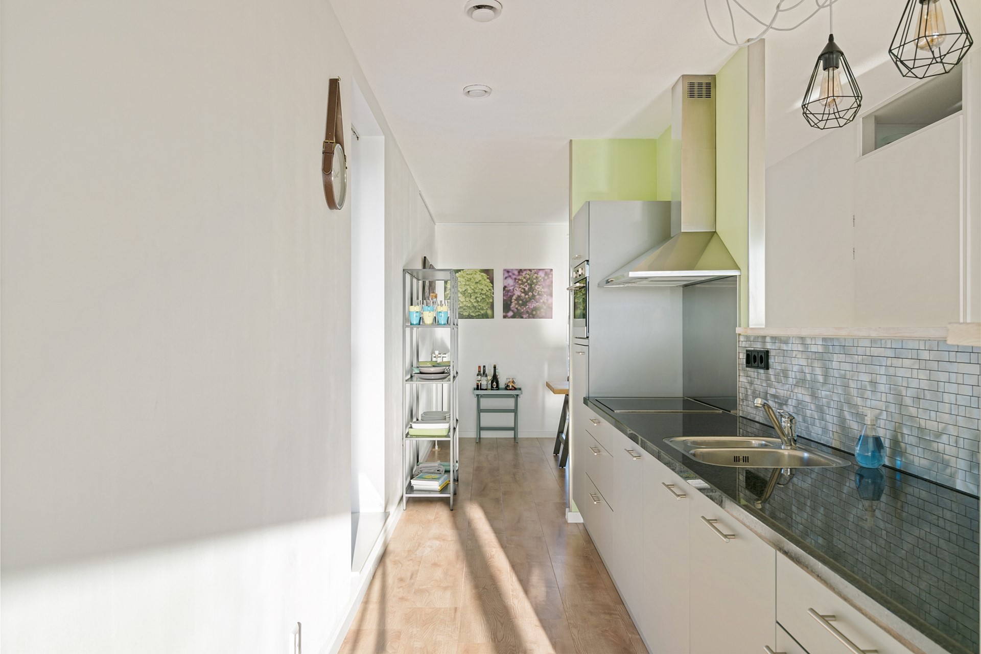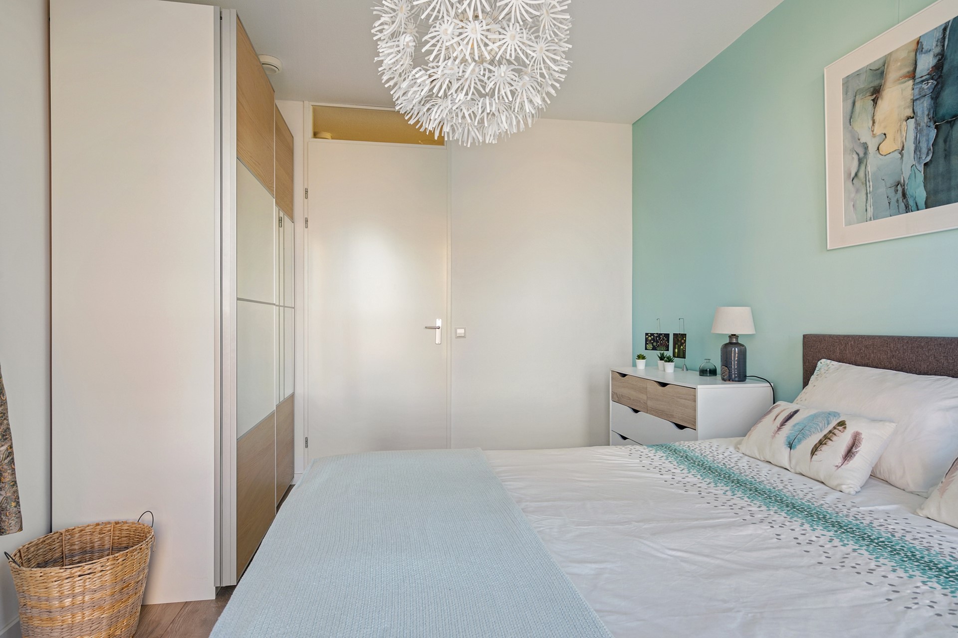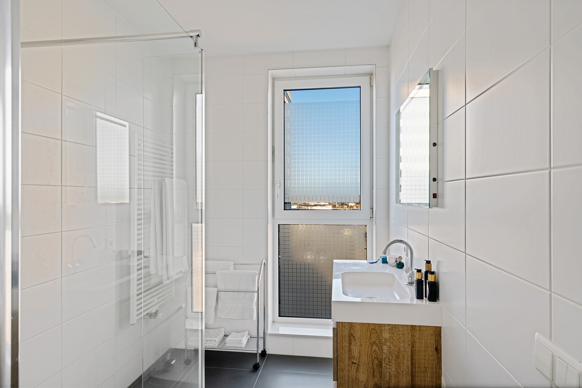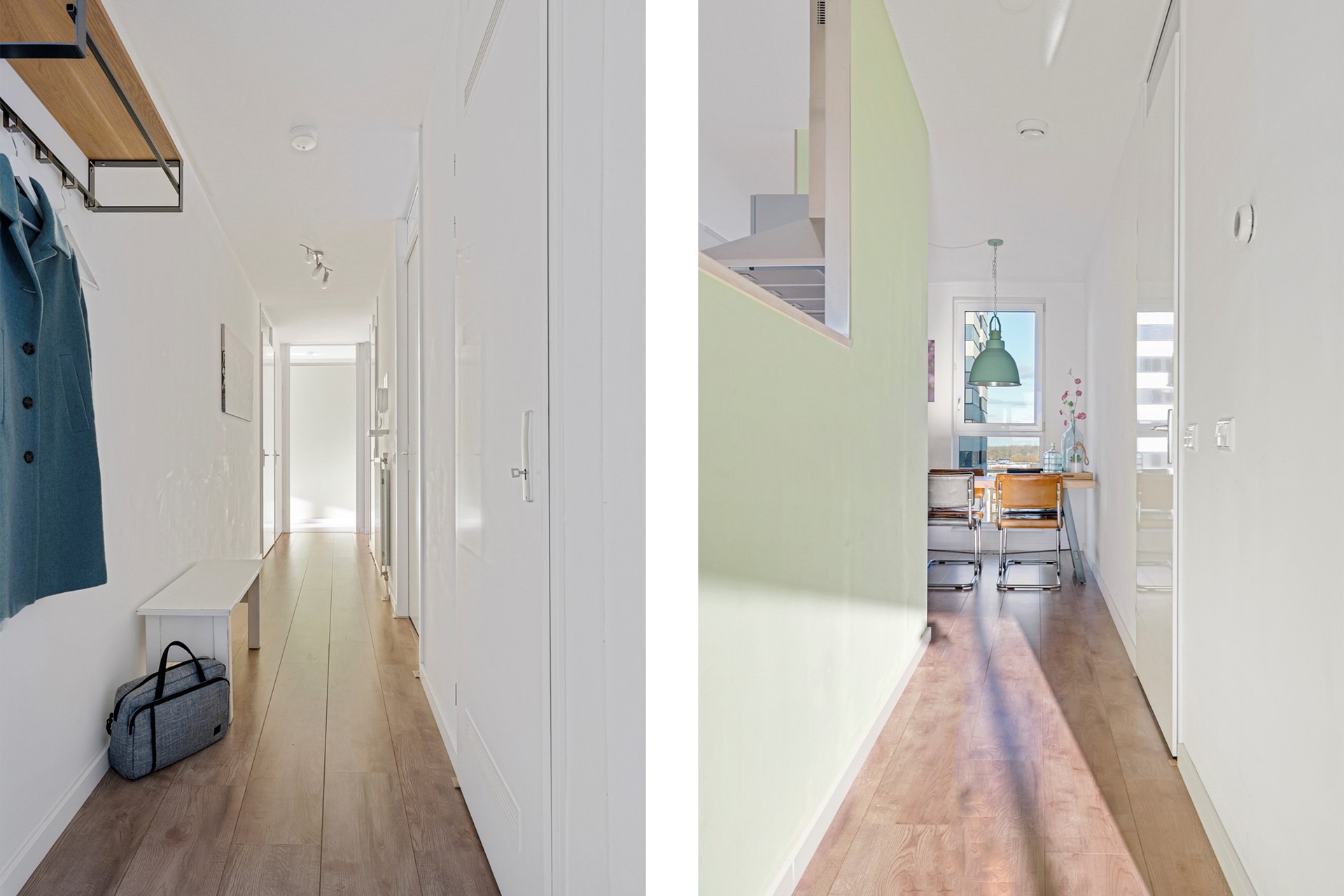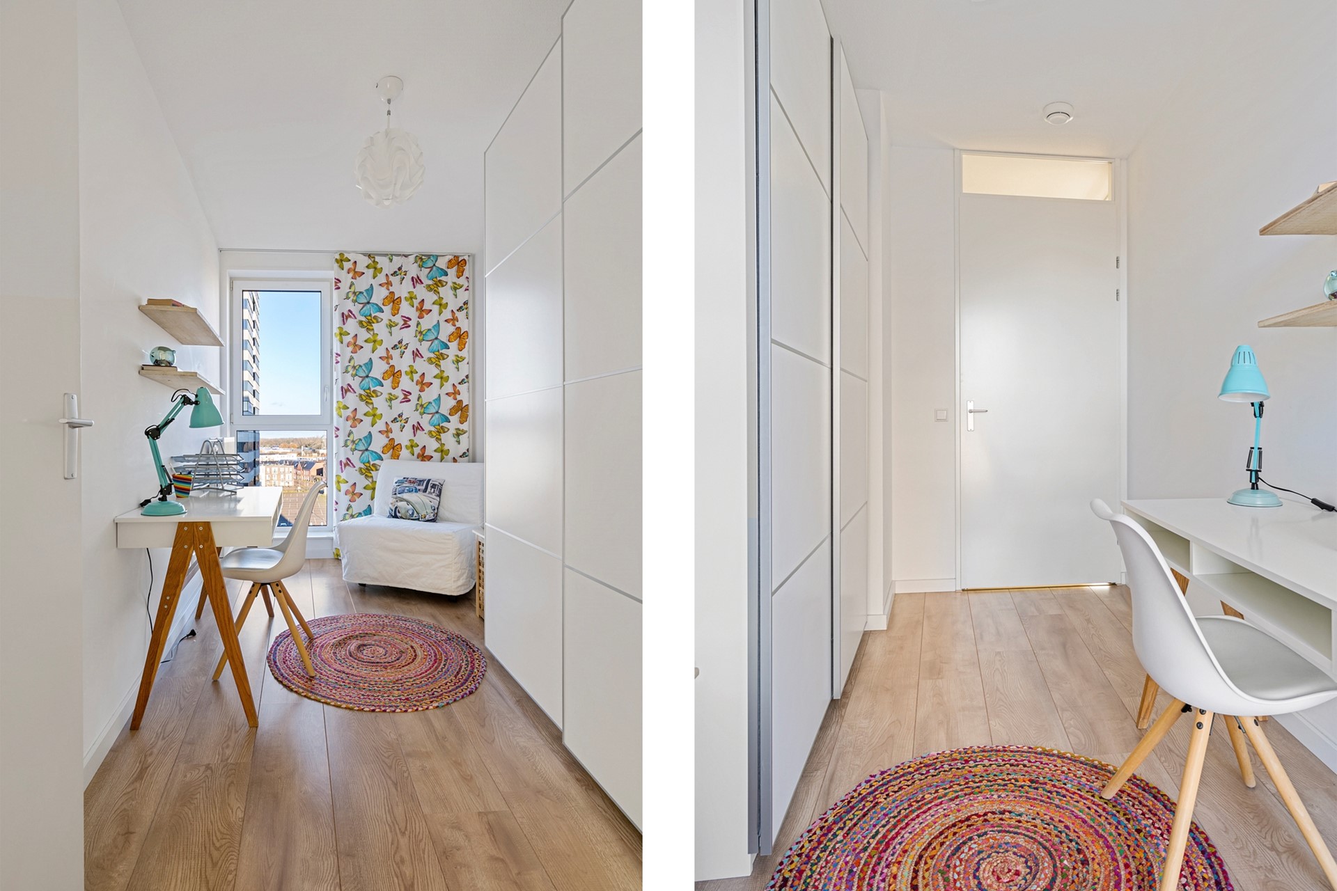 7de etage: Ook op deze etage valt de hoogwaardige afwerking van het appartementencomplex direct op. Je betreedt het appartement via een ruime hal, die toegang biedt tot alle vertrekken. Direct rechts vind je de badkamer voorzien van een inloopdouche, wastafel en wastafelmeubel en handdoekradiator. Naast de badkamer bevindt zich een aparte ruimte, voorzien van de wasmachine- en droger aansluiting. Als je verder loopt vind je aan je rechterhand de kast met de stadsverwarming unit voor verwarming en warm water, twee (slaap)kamers en een aparte kast met de elektrameter. Tegenover de slaapkamers bevindt zich het loshangende toilet met fonteintje en een aparte bergruimte met de MV-installatie. Het gehele appartemens is voorzien van een fraaie laminaatvloer.