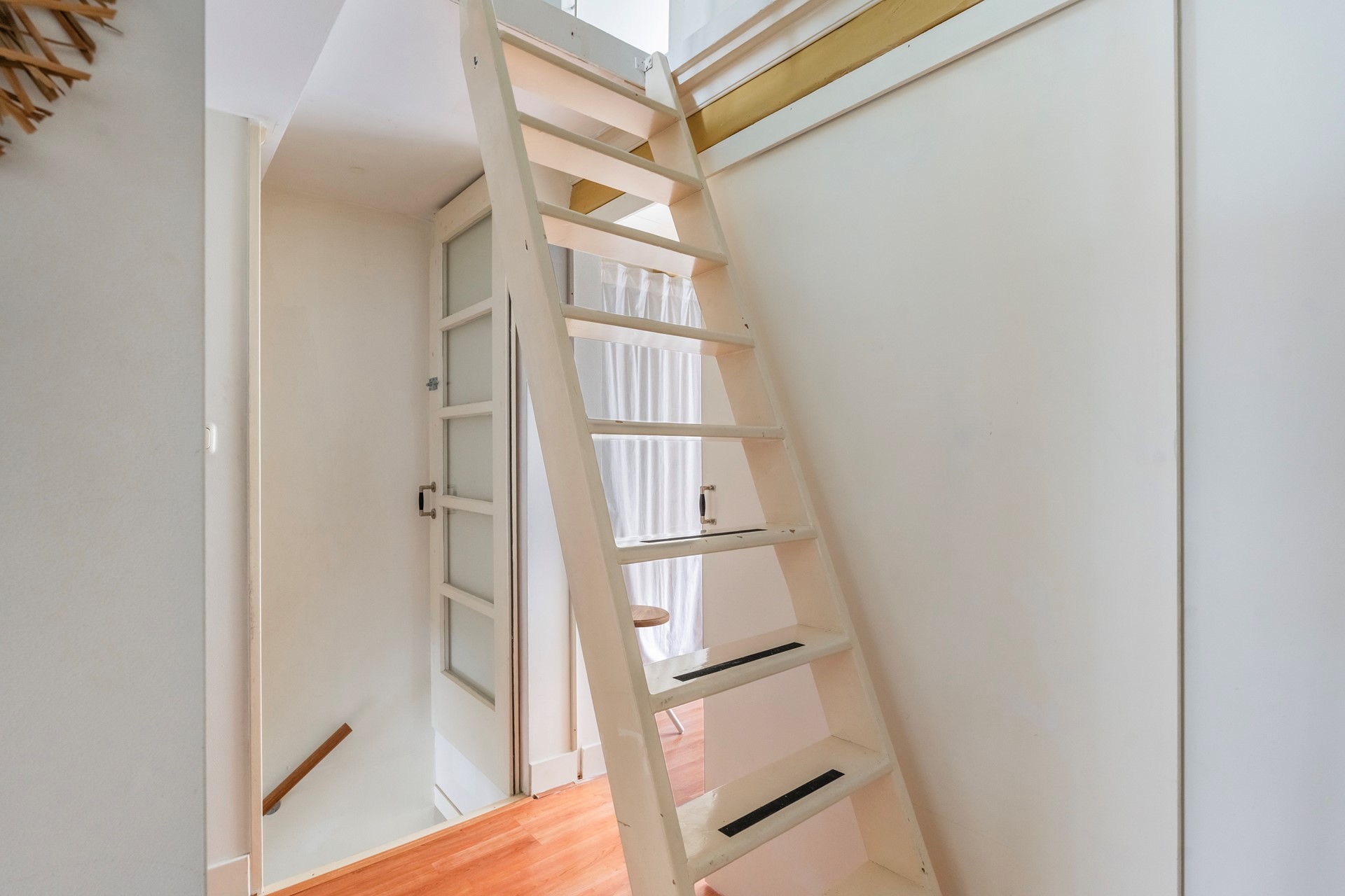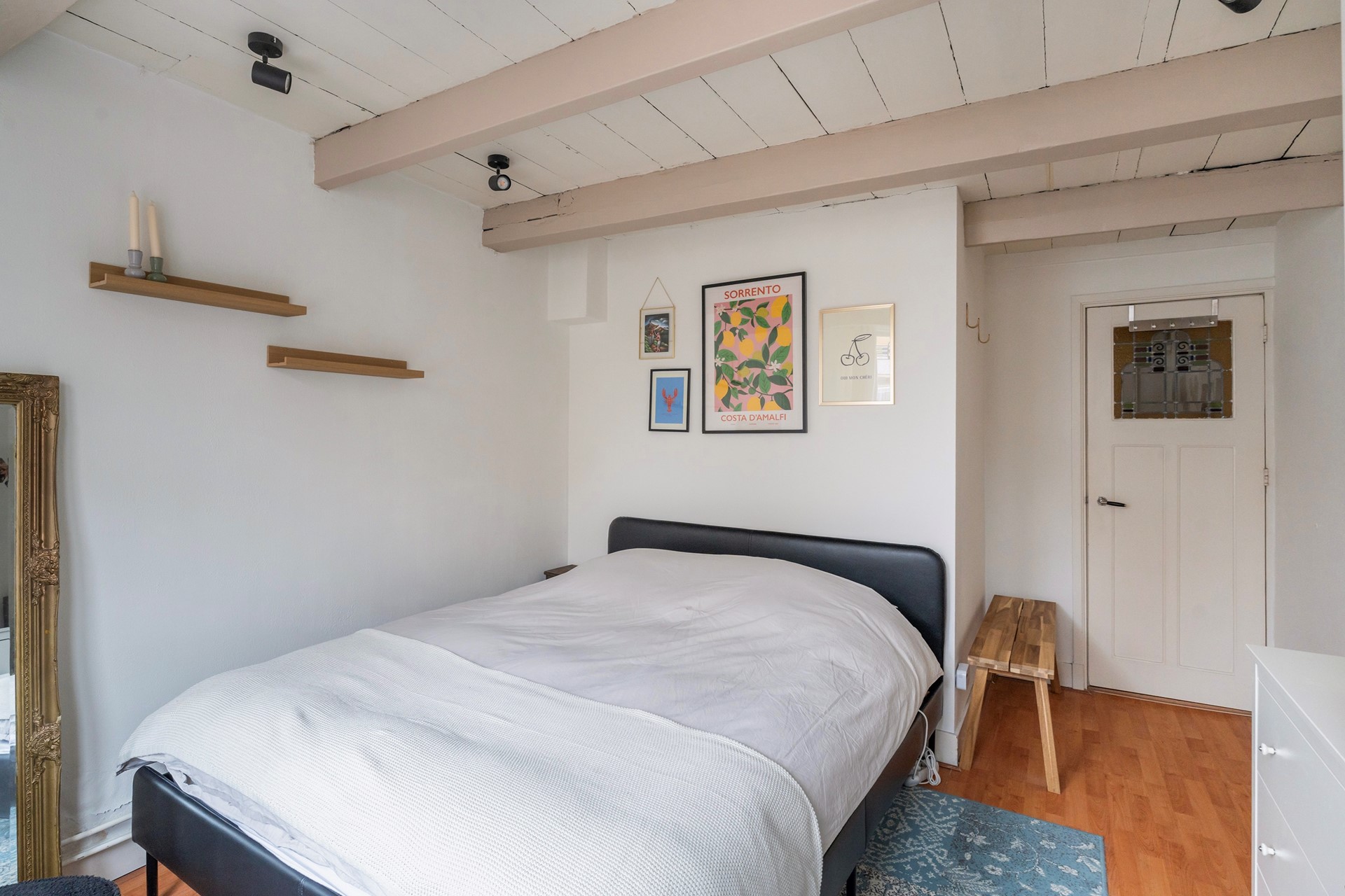 Vanuit de woonkamer is via een vaste open trap de 1e etage te bereiken. Boven aan de trap bevindt zich een praktisch weggewerkte schuifdeur om de warmte beneden te houden. Aan de linkerkant betreedt je de 1e slaap-/ studeerkamer. Een prachtige kamer waar de originele balkenplafond volledig zichtbaar is. Daarnaast is via een tweetal grote ramen/ deuren het heerlijke dakterras (zie: balkon).