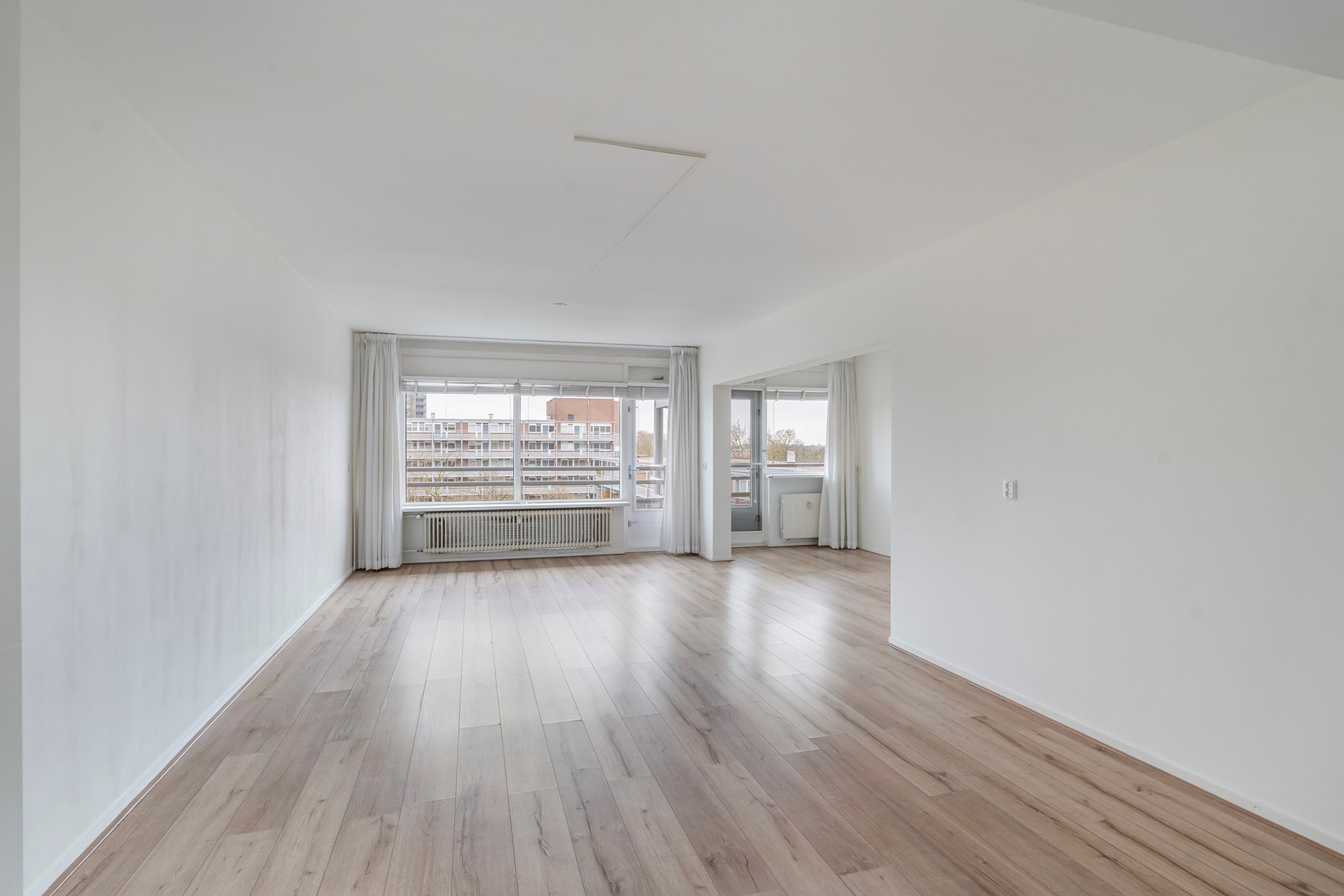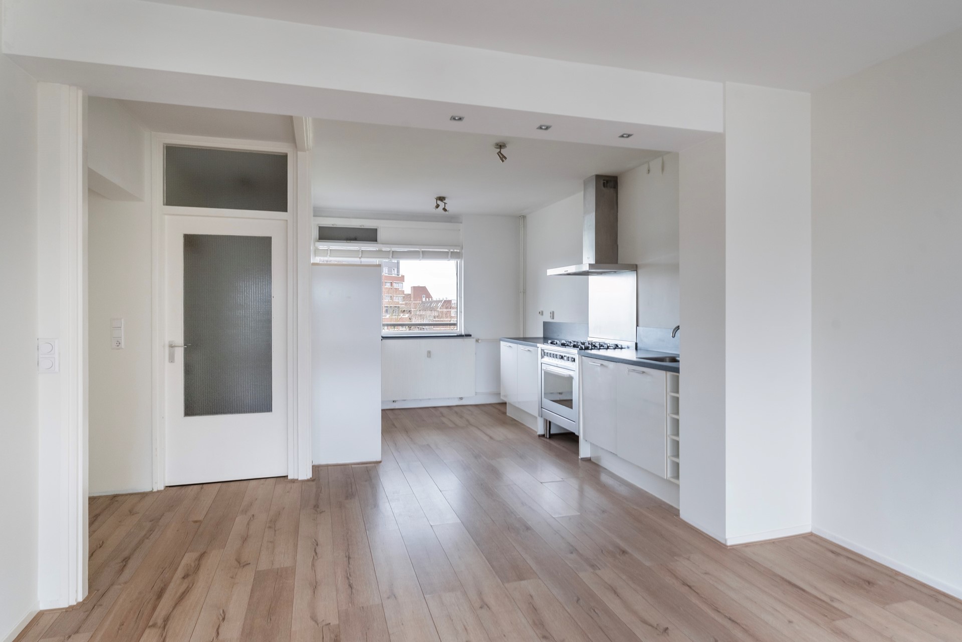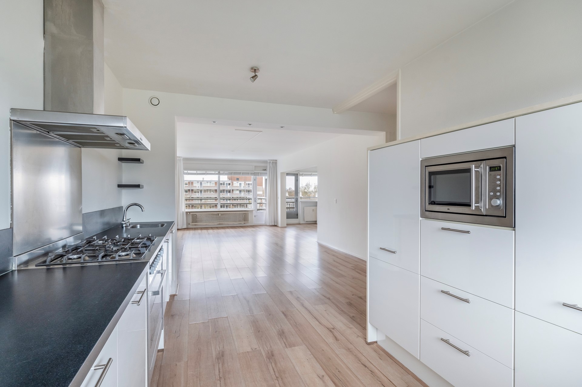 De open keuken is praktisch ingericht en voorzien van inbouwapparatuur. De royale woonkamer met eetgedeelte is gesitueerd op het zuid-westen en biedt direct toegang tot het balkon. Hier geniet je van een vrij en groen uitzicht op het naastgelegen park De Houtkamp.