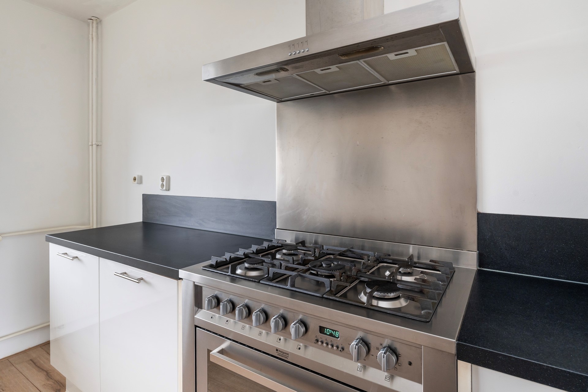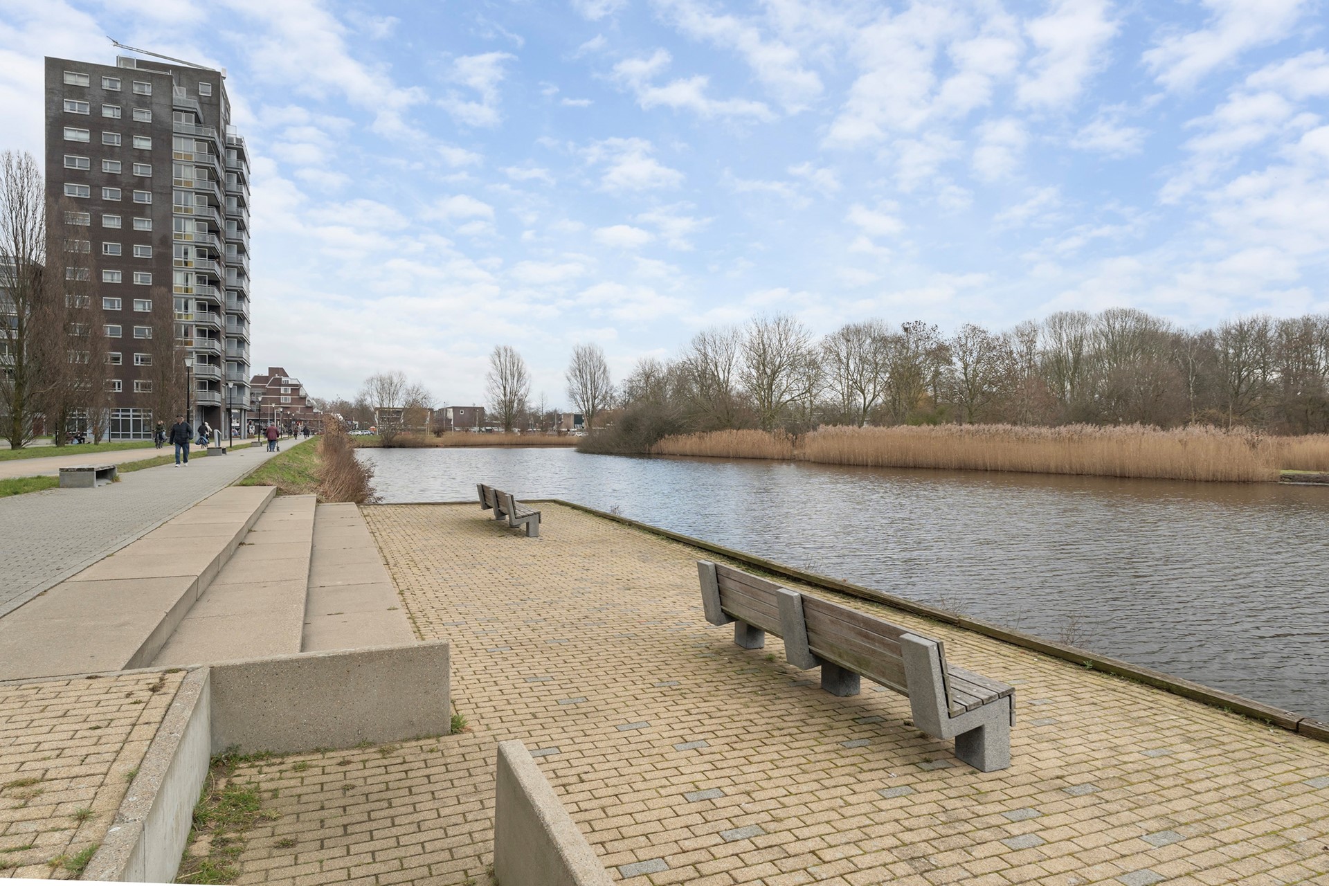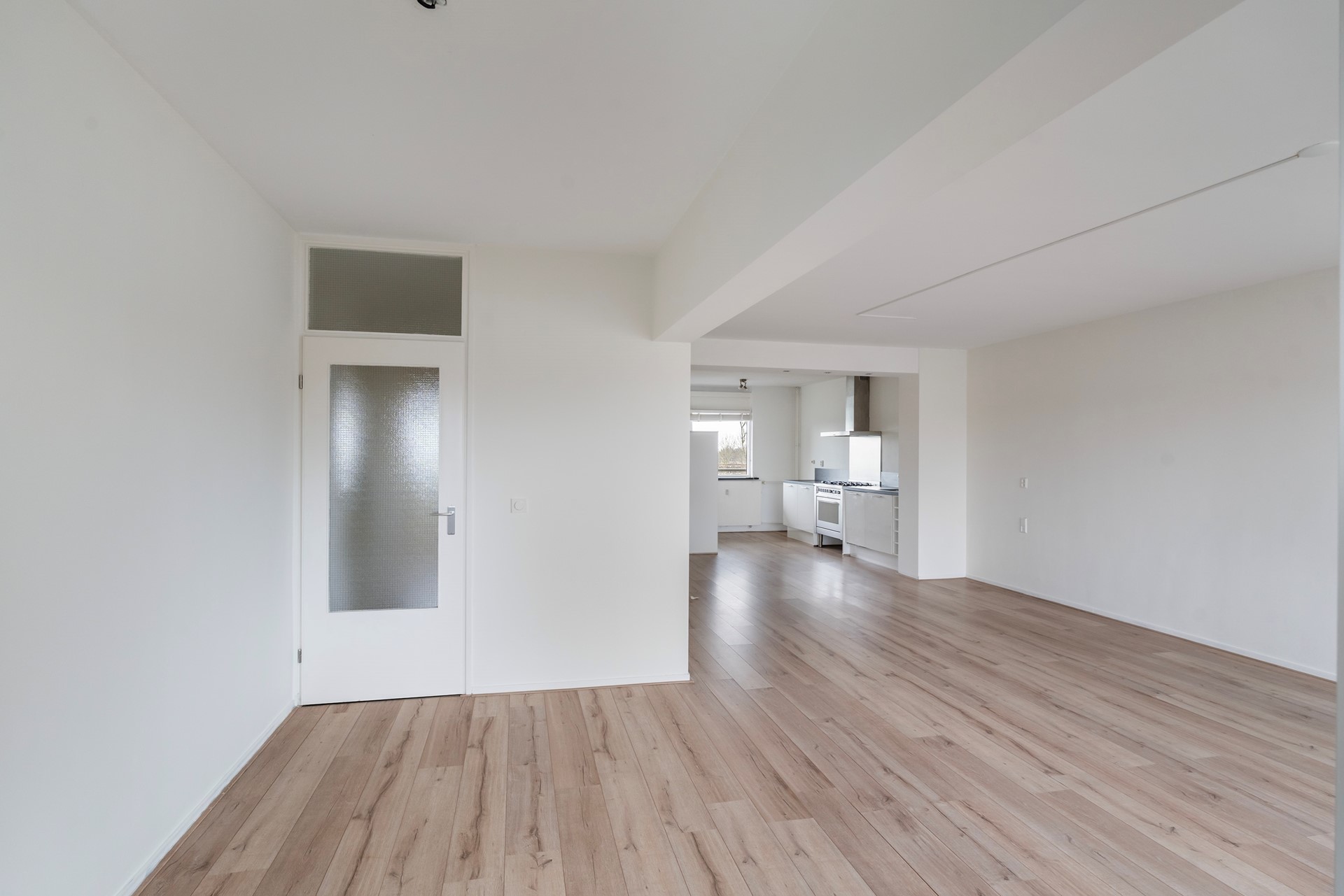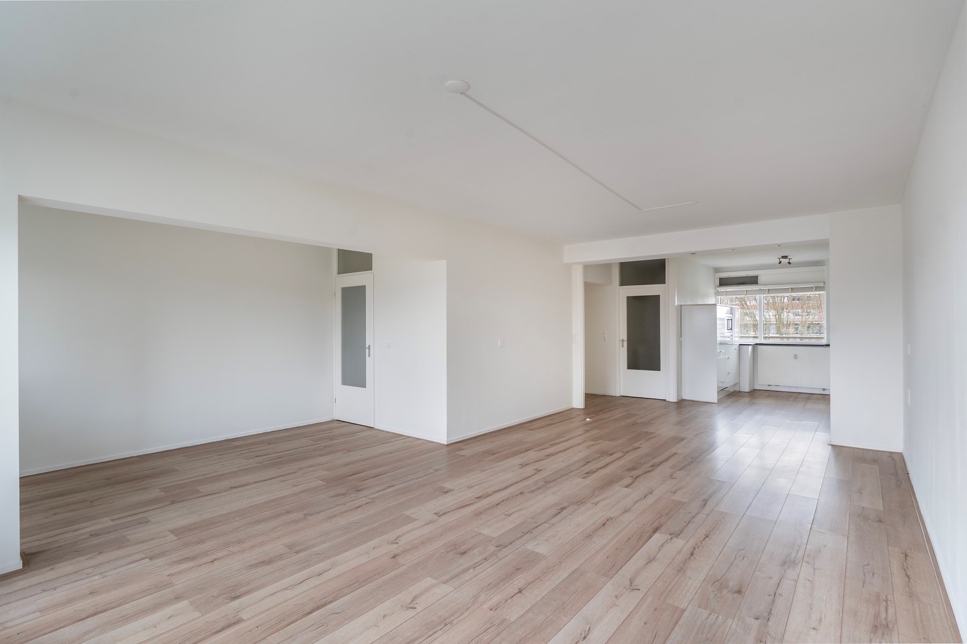 De open keuken is praktisch ingericht en voorzien van inbouwapparatuur. De royale woonkamer met eetgedeelte is gesitueerd op het zuid-westen en biedt direct toegang tot het balkon. Hier geniet je van een vrij en groen uitzicht op het naastgelegen park De Houtkamp.