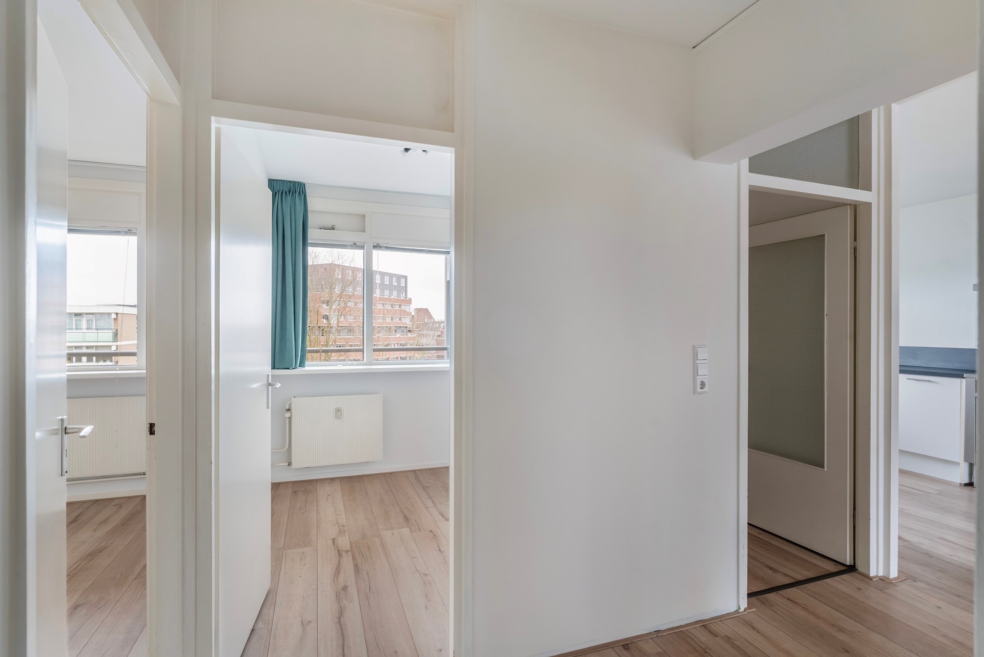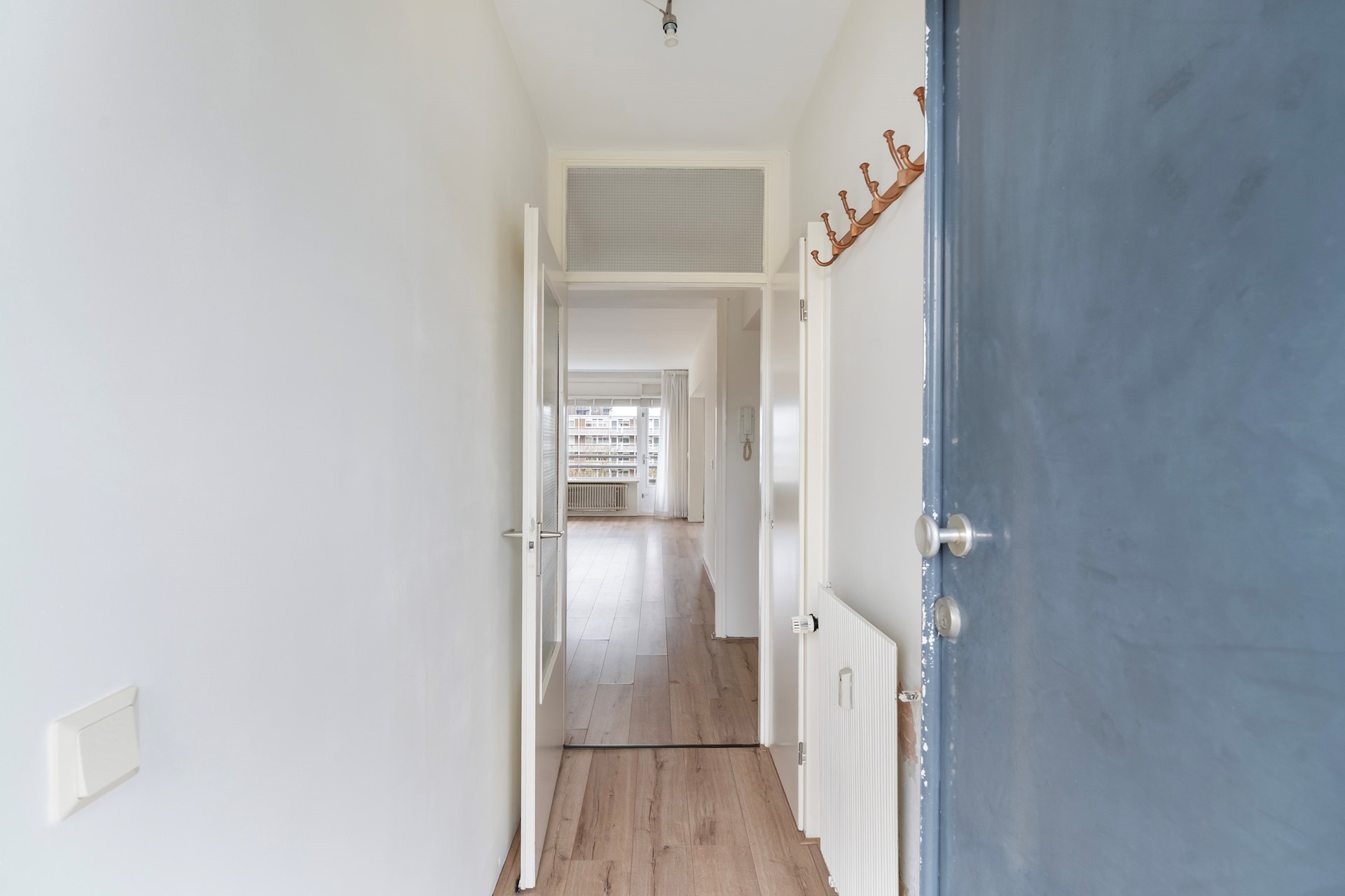 Via de centrale entree met bellentableau en brievenbussen bereik je de vijfde verdieping per lift of trap. Het appartement is gelegen aan een galerij. Na binnenkomst via de entree kom je in de ruime hal van waaruit alle vertrekken bereikbaar zijn.